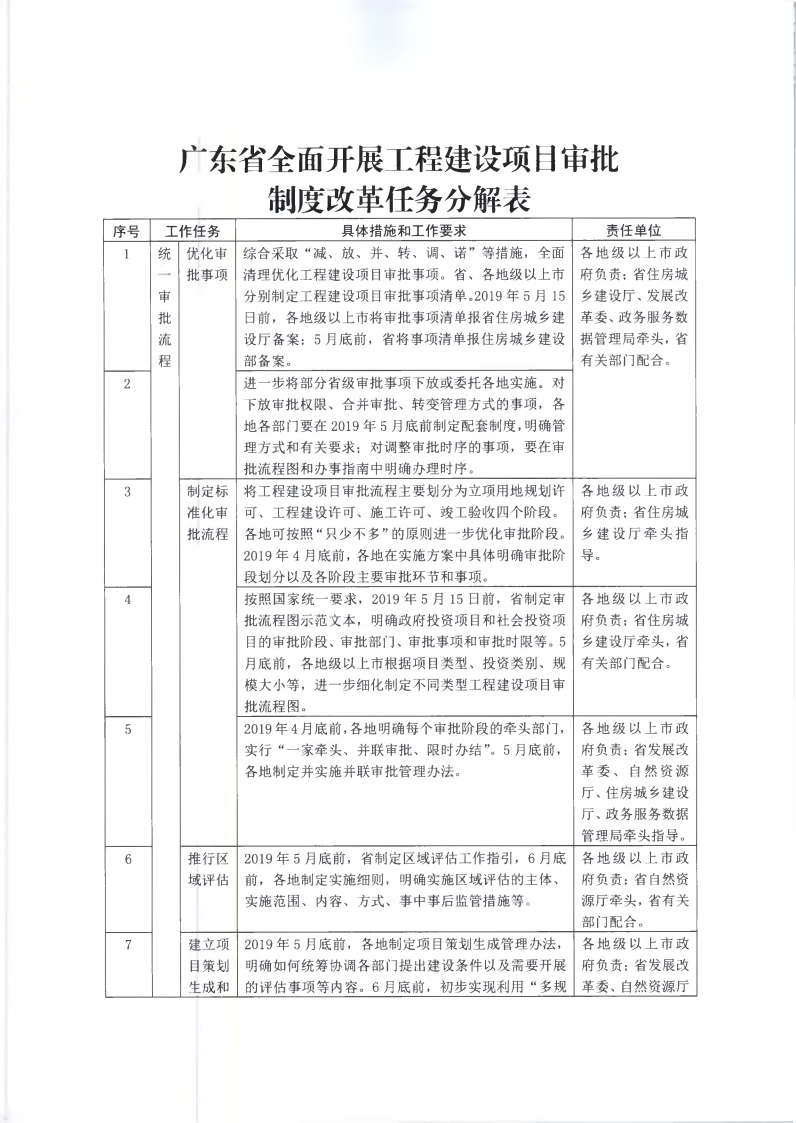 為貫徹落實(shí)《國(guó)務(wù)院辦公廳關(guān)于全面開(kāi)展工程建設(shè)項(xiàng)目審批制度改革的實(shí)施意見(jiàn)》(國(guó)辦發(fā)〔2019〕11號(hào))和《廣東省人民政府關(guān)于印發(fā)廣東省全面開(kāi)展工程建設(shè)項(xiàng)目審批制度改革實(shí)施方案的通知》(粵府〔2019〕49號(hào))要求,經(jīng)省人民政府同意,現(xiàn)將《廣東省全面開(kāi)展工程建設(shè)項(xiàng)目審批制度改革任務(wù)分解表》印發(fā)給你們,請(qǐng)認(rèn)真組織實(shí)施。
